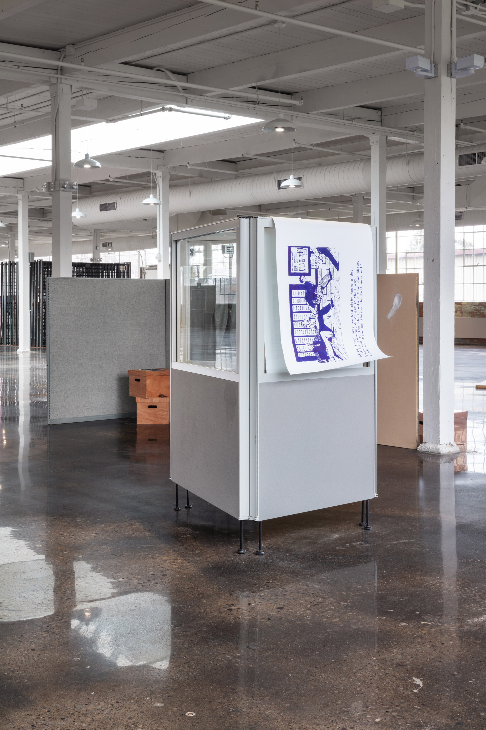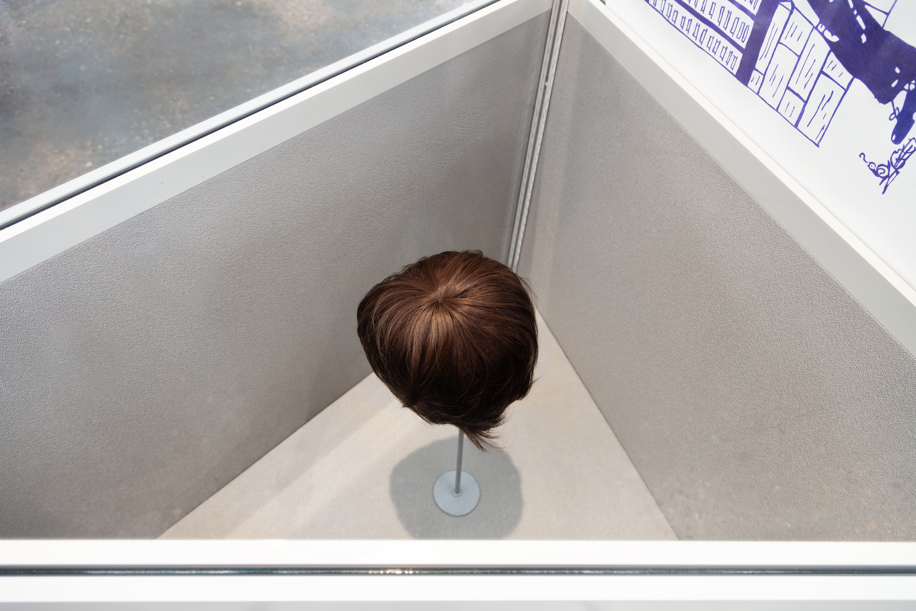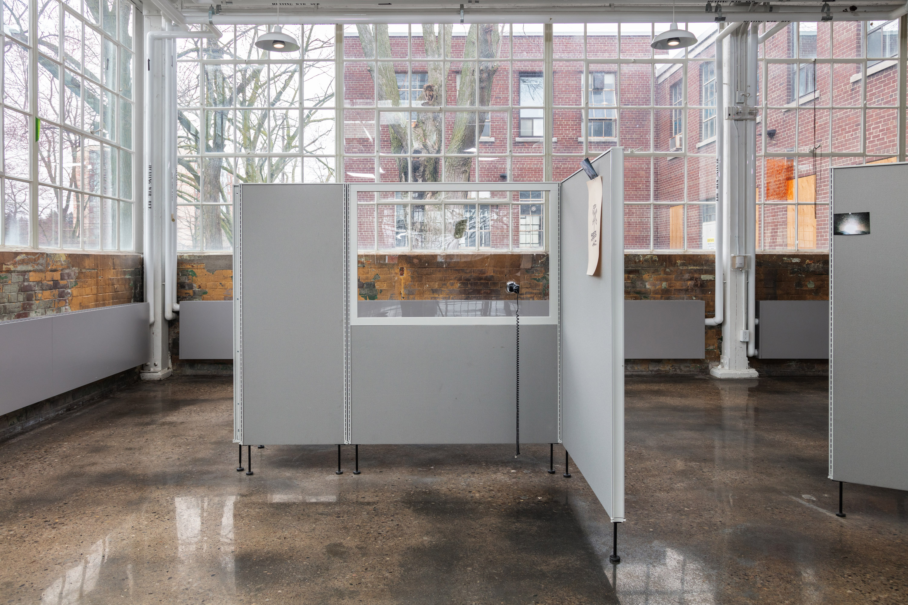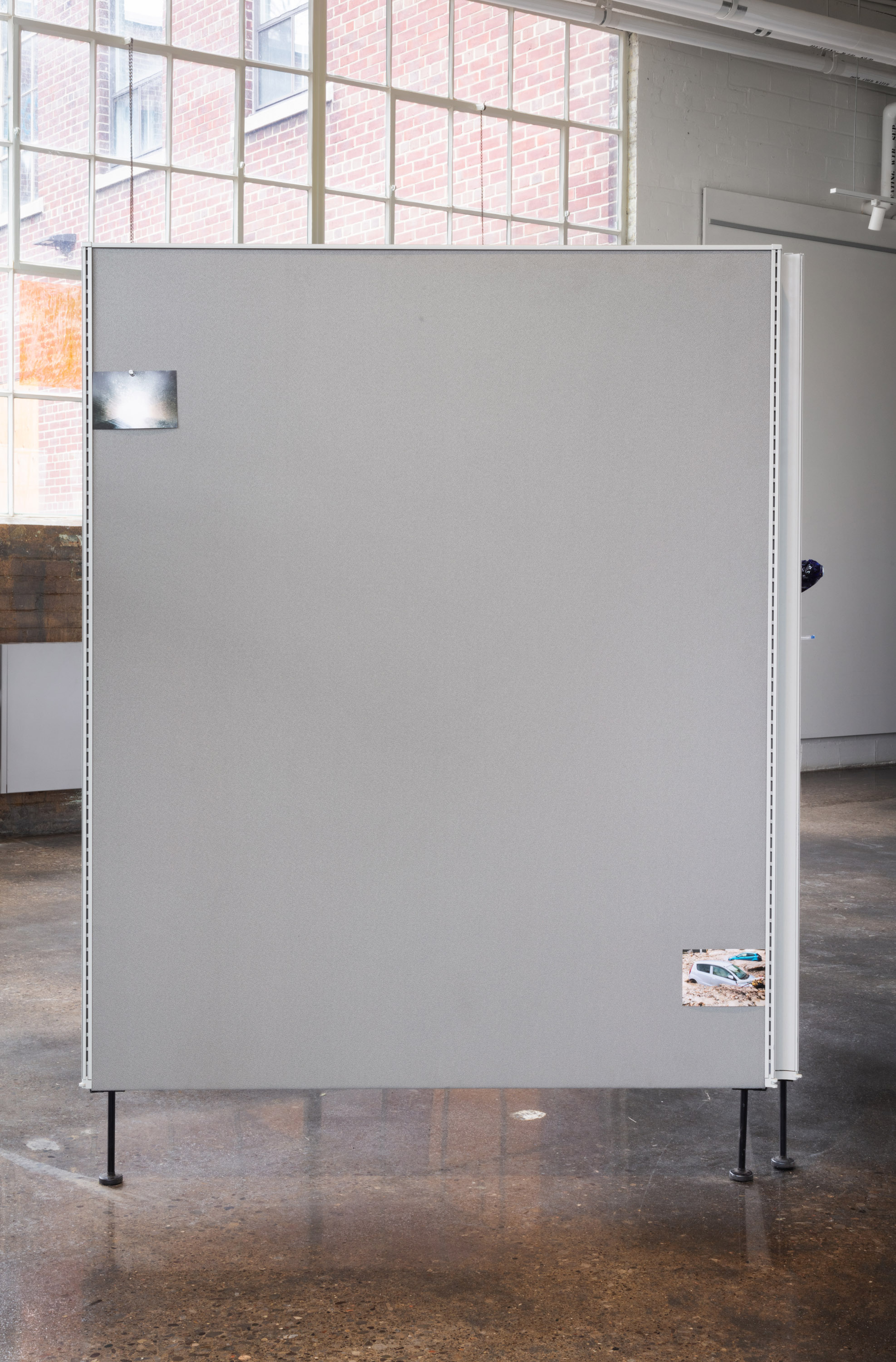 Cubicle partitions, glass, cullet, plexiglass, found objects, 4 x 6 color photos, stained glass, MDF, plywood & rose-gold mirrored acrylic bankers’ boxes, ceramic plate, thermal receipt, reprinted archival material, ballpoint pen drawing on paper, wig, upholstery, bespoke suit set made of cubicle upholstery, acrylic paint on paper, magnets, foundry wax, scorched burl wooden bowl, vitrail, wig, office phone handset, oil-stick on stripped and primed cubicle partition, oil-based stain on wood, commercially printed canvas.