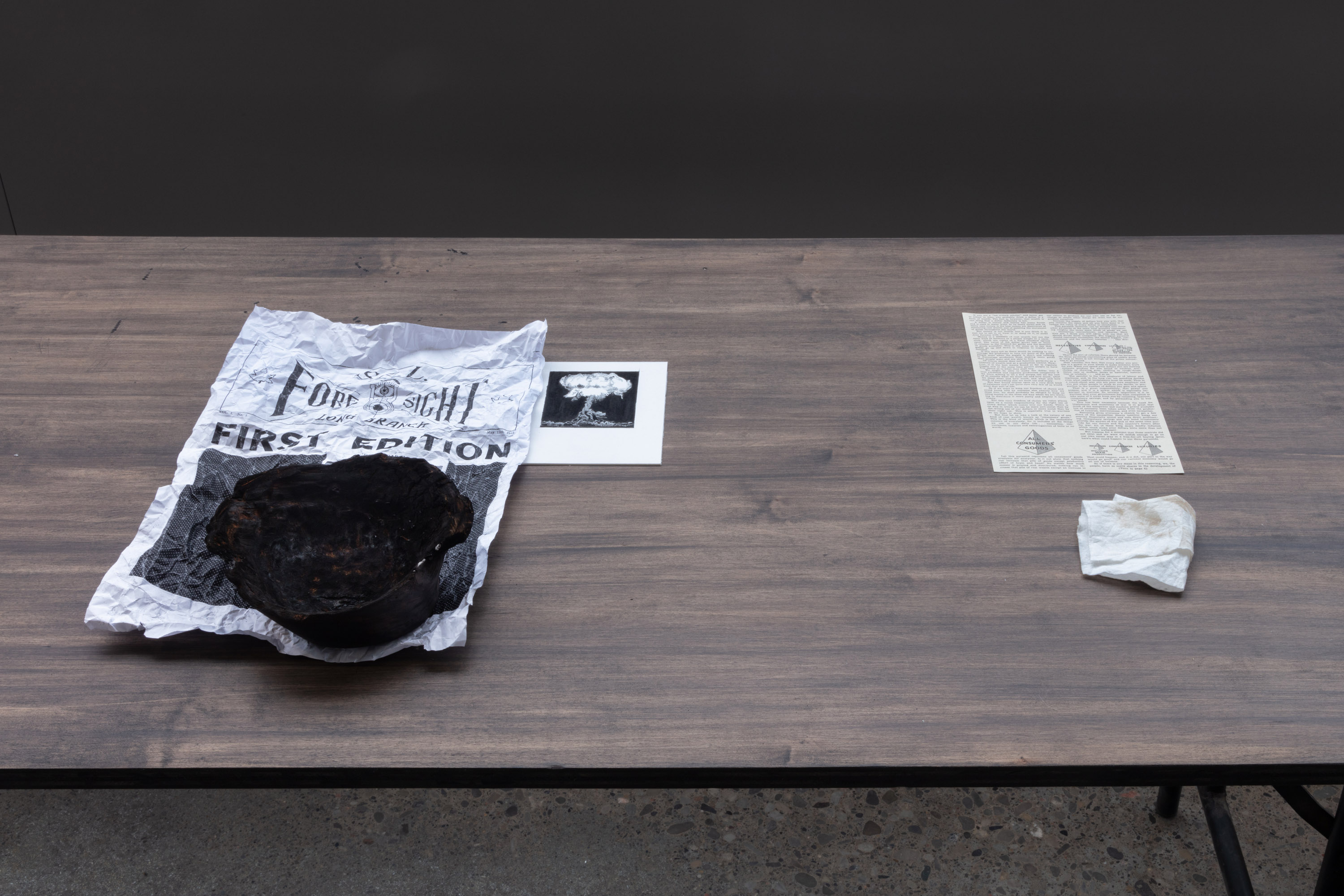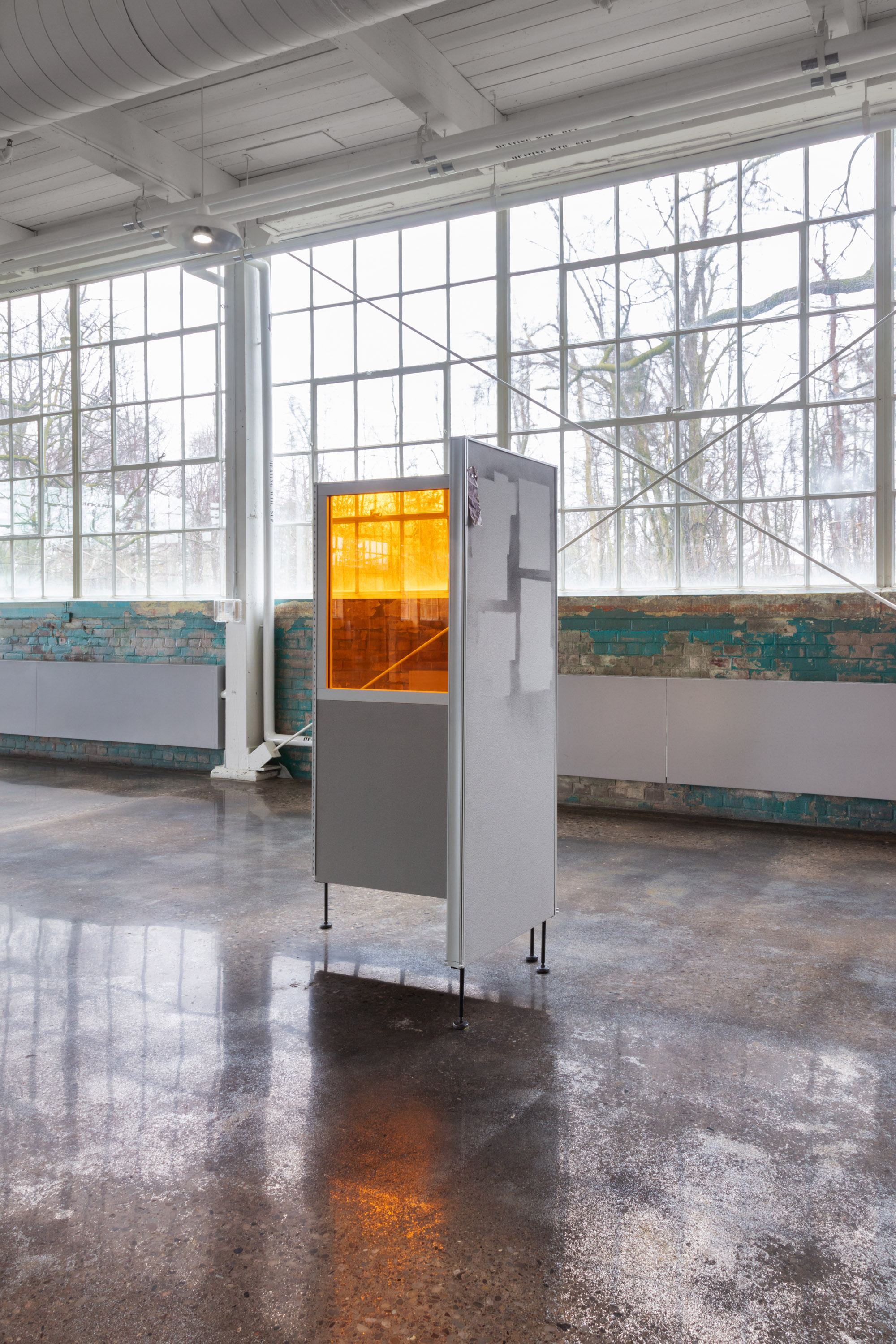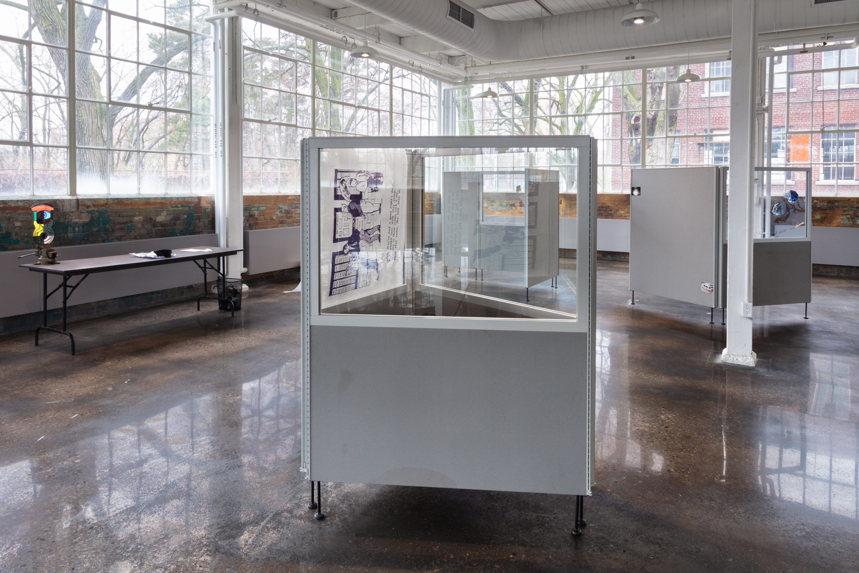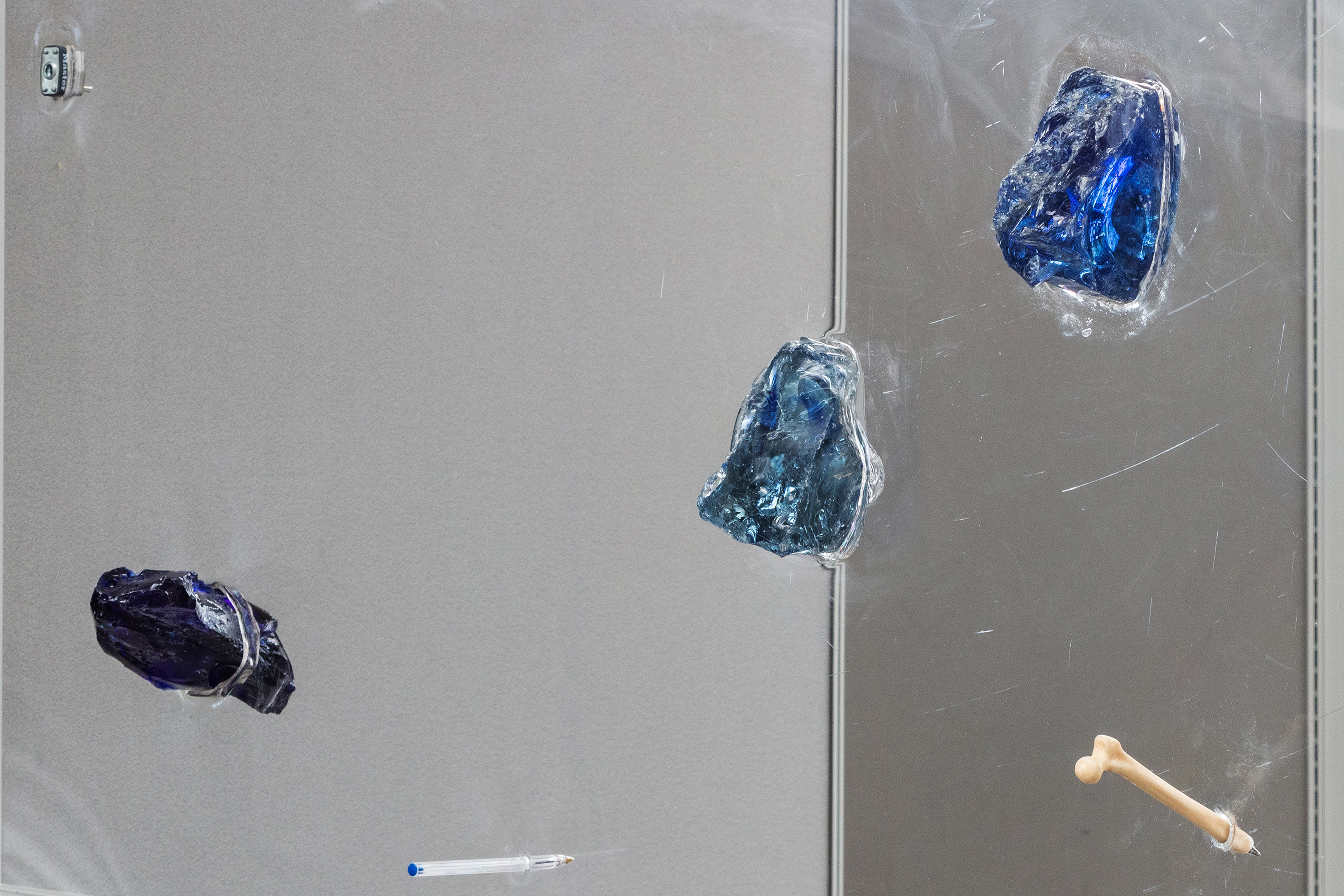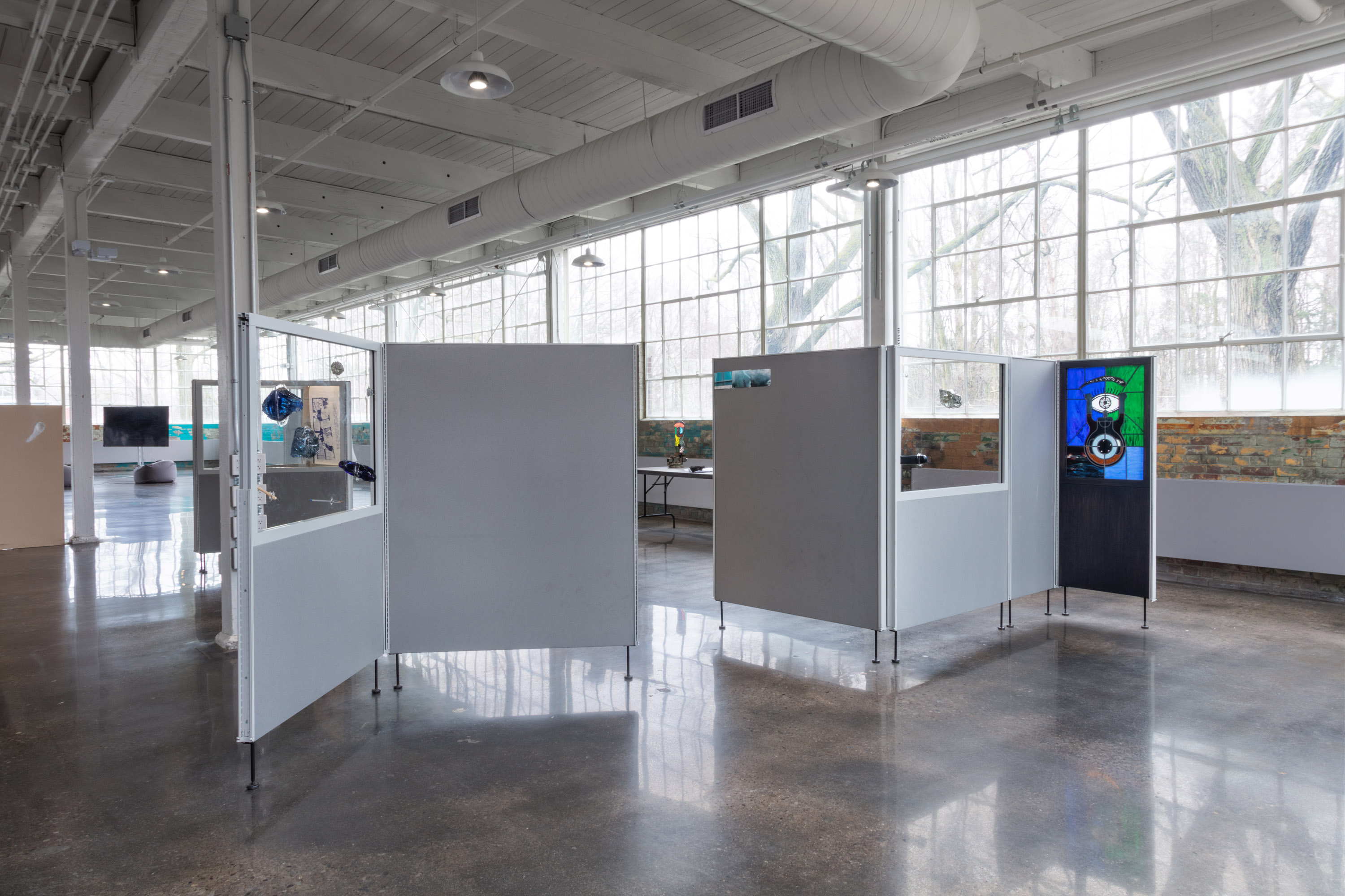 Cubicle partitions, glass, cullet, plexiglass, found objects, 4 x 6 color photos, stained glass, MDF, plywood & rose-gold mirrored acrylic bankers’ boxes, ceramic plate, thermal receipt, reprinted archival material, ballpoint pen drawing on paper, wig, upholstery, bespoke suit set made of cubicle upholstery, acrylic paint on paper, magnets, foundry wax, scorched burl wooden bowl, vitrail, wig, office phone handset, oil-stick on stripped and primed cubicle partition, oil-based stain on wood, commercially printed canvas.