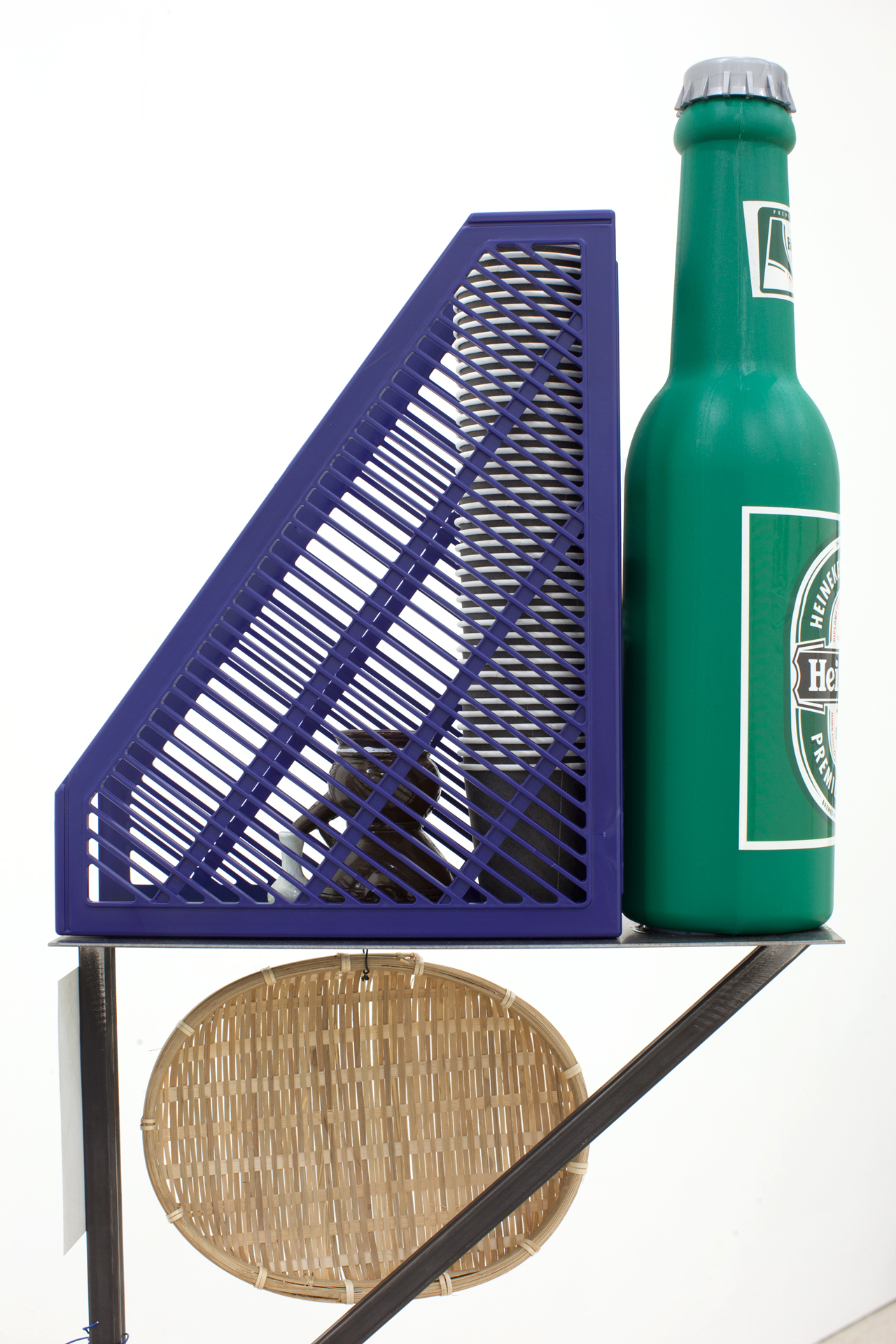 Custom fabricated metal armatures, items purchased from local discount store and ink on paper.